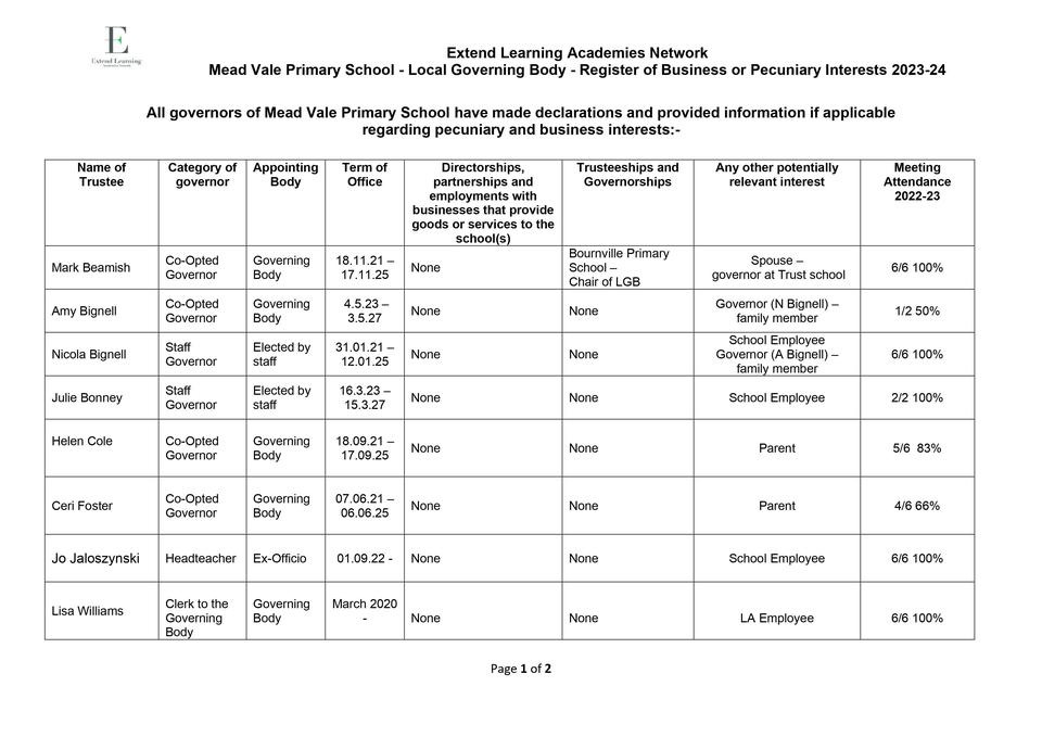 To contact the Chair of Governors, please email: mark.beamish@meadvale.extendlearning.org or write to Mr. Mark Beamish at the school postal address.