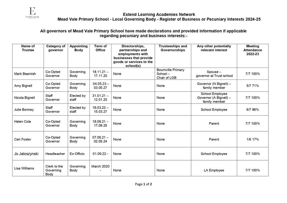 Each school within ELAN has a Local Governing Body (LGB). The LGB of Mead Vale Community Primary School aims to support the whole community of the school using their varying skills, strengths and expertise from all walks of life to enrich the work of the governing body and improve the governance of the school.