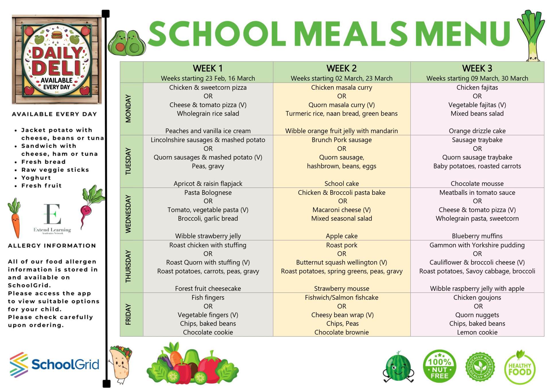 There will be a meat choice, a vegetarian choice, jacket potatoes sandwiches and hot pasta choice. Parents are able to book and pay for meals directly with School Grid.