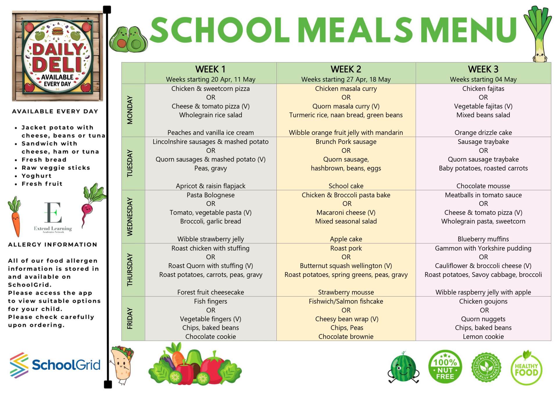There will be a meat choice, a vegetarian choice, jacket potatoes sandwiches and hot pasta choice. Parents are able to book and pay for meals directly with School Grid.
